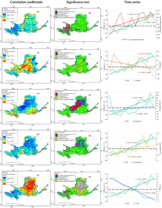 Spatial distribution and time series map of correlation analysis between vegetation NPP and five factors in YRB. (a,c,e,g,i) are the spatial distribution map of correlation coefficients between NPP and five factors (accumulated temperature, sunlight, precipitation, temperature, and TWS) in YRB; (b,d,f,h,j) are the spatial distribution map of significance test between NPP and five factors in YRB); the solid line represents the time series, and the dashed line represents the linear trend.