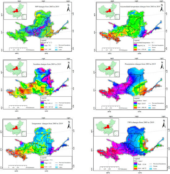In order to comprehensively analyze the relationship between dynamic factors and NPP changes, we focused on the correlation between NPP and climate factors (accumulated temperature, sunlight, precipitation, and temperature), as well as water reserves. In addition, we selected nine factors for single-factor analysis with NPP.