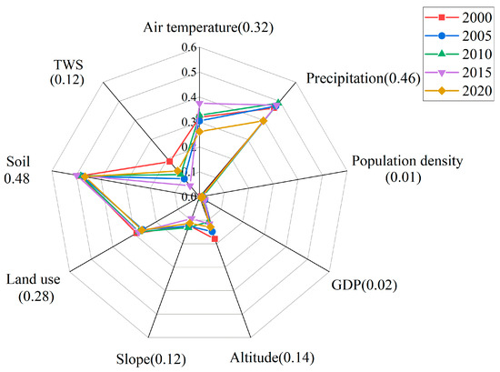 In order to comprehensively analyze the contribution of various factors to the changes in vegetation NPP in the YRB, based on the conclusions from earlier discussions, we selected nine factors for comprehensive assessment. These factors include two climate-related factors, temperature, and precipitation, as well as land water storage, population density, GDP factors, two topographical factors, elevation and slope, and two land-related factors, land use and soil type. Considering data availability and the need for a detailed analysis of the impact of each factor, we used a geographic detector to calculate the contribution rates for different factors for the years 2000, 2005, 2010, 2015, and 2020 to evaluate the influence of different factors on NPP (as shown in Figure 13).