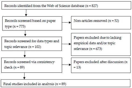 The two researchers separately selected the papers to be analyzed in the current study from the initial sample of 827 articles. The main criteria for selection included classification as an article among various types of papers (e.g., articles, book reviews, editorial materials), the use of empirical data to identify training or learning needs, and topical relevance at the abstract level. The articles chosen by the two researchers were compared to verify selection consistency. Any inconsistencies were resolved through the discussion to finalize the selection. For instance, studies that focused primarily on the summative evaluation of training or educational programs, or on the development of a needs assessment measurement tool, rather than on identifying specific training or learning needs, were excluded. This refined the focus for the subsequent procedure. Consequently, a total of 89 articles were selected for review in the current study. The data collection process is summarized in Figure 1. A PRISMA flow diagram provides a simple and realistic solution for illustrating the screening flow of relevant papers [].