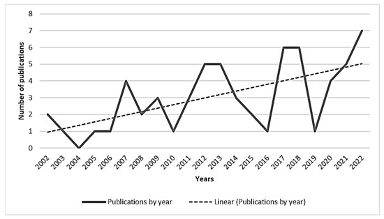 The articles included in the literature review spanned from 2002 (two articles) to 2022 (seven articles). Figure 2 illustrates an increasing trend in publications, notably surging after 2017. Despite a decline in 2019, 46% of publications emerged after that date.