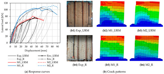 Validation of the unreinforced masonry (URM) and retrofitted (R) wall models by means of a comparison between the envelope (Env) of the experimental curves (Exp) [17] and the results of the simplified (M1) and detailed (M2) models.