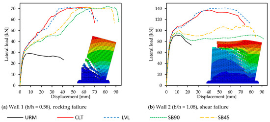 The effectiveness of the proposed retrofit solution was further investigated using the modelling approaches described in the previous sections. The timber retrofits were applied to two double-leaf clay brick masonry walls characterized by different aspect ratios (i.e., b/h 0.58 and 1.08) and failure modes (i.e., rocking and shear). Such walls were 3000 mm high and 250 mm thick. The bricks’ dimensions were 240 × 120 × 75 mm, and the bed joints were 15 mm thick. The overburden was applied as a uniform pressure of 0.1 MPa, a conservative value representing the vertical load typically encountered in a three-story URM building. The horizontal load was applied to the side of the masonry walls at an average height from the base of 2565 mm, targeting the blocks within the third, fourth, and fifth rows from the top. The adopted masonry properties are shown in Table 1. The retrofit was provided by a single timber panel as long as the wall for the slender wall (wall 1) and by three side-by-side panels for the stocky and longer wall (wall 2). The panel-to-panel side connection for the solutions where CLT and LVL panels were used was realized by inserting fully threaded timber screws at an angle of 45° to the joint line (8 mm diameter screws spaced at 200 mm). The layout of the masonry-to-timber connections was the same for all the investigated retrofit configurations matching that of the experimental campaign reported in [17] (≈4 fasteners/m2, horizontal spacing = 500 mm, vertical spacing = 540 mm). The timber strong-backs and the horizontal timber “blocking” elements were fixed to the masonry wall by adopting the same fastener spacing used for the solutions with the timber panels. The OSB sheets were connected to the timber frames with nailed connections (fastener spacing = 100 mm) and, if multiple OSB sheets were used, the sheet-to-sheet joints were realized in correspondence with the strong-back location. Tensile anchors (i.e., hold-downs) were fixed next to the wall’s corner while a single shear anchor (angle bracket) for each timber panel was used. The timber properties were determined assuming a timber grade C24 for the boards of the CLT panels [41] and a timber grade C18 for the strong-backs [41]. The properties of the equivalent materials used to simulate the LVL panels and OSB sheets were defined as indicated in [42] (LVL-X) and [43] (OSB 3). The timber-to-masonry connection properties were calibrated on the experimental outcomes reported in [15], the properties of the anchors were defined based on the experimental results reported in [44], the timber panel-to-panel side connections were modelled as recommended by [45], and the OSB panels-to-timber connections were implemented considering the experimental results reported in [46].