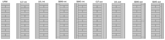 The retrofit solutions studied herein consist of connecting timber-based products (panels and strong-backs) to the surface of the walls of a building using mechanical point-to-point connections, with the aim of improving the in-plane and the out-of-plane capacity of the URM walls. Insulation layers, membranes, and finishing layers were added to guarantee the durability of the timber elements and to improve the thermophysical performance of the retrofits. Four solutions were analyzed with the structural retrofit provided by cross laminated timber (CLT) panels, laminated veneer lumber (LVL) panels, or by two different combinations of timber strong-backs and oriented strand boards (OSB) panels (referred to as “frame and sheathing” solutions). Two configurations of the non-structural layers were designed for each solution, acknowledging that the intervention could be applied to either the internal or external side of the masonry walls (see Figure 1). The selected thicknesses of the timber panels were compatible with those used for the in situ campaigns performed by [15,16,17], while the timber strong-back cross-sections were selected based on the experimental campaigns reported in [25,26].