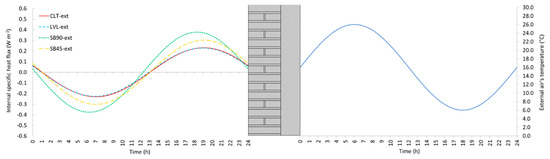 Smaller performance enhancements were obtained for the SB90-int solutions, where the highest oscillation in terms of internal heat flux and the lowest phase shift was noticed (11.9 h). The presence of 90 mm of PIR insulation, which is characterized by higher thermal diffusivity than bulk layers like either CLT or LVL, leads to higher values of periodic thermal transmittance (Yie) and decrement factor (f), and lower phase shift (Δτie).