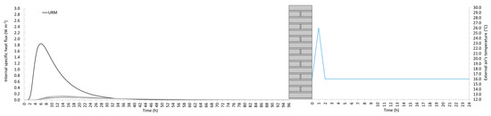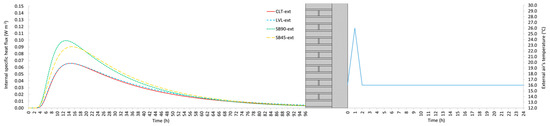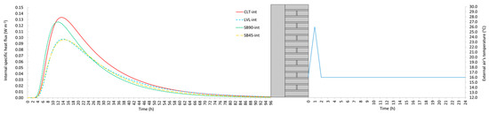 Figure 8, Figure 9 and Figure 10 summarize the results in terms of specific heat flux after the impulsive temperature excitation. Figure 8 represents all the heat fluxes comprising the behaviour of the URM wall. Figure 9 and Figure 10 give instead the heat fluxes obtained on the internal side, separately for external and internal retrofit solutions, respectively. Results on the left side are displayed for a period of 96 h, while the temperature profile spans just 24 h for the sake of clarity. The temperature was maintained constant at 16 °C after the temperature impulse until the end of the simulation. Figure 11 and Figure 12 represent the response factor on the non-excited side on the wall after the application of a unitary temperature excitation on the opposite side, obtained by dividing the internal specific heat flux by the magnitude of the temperature excitation (i.e., 10 K) and then by sampling the data series every hour.