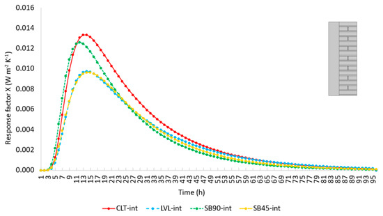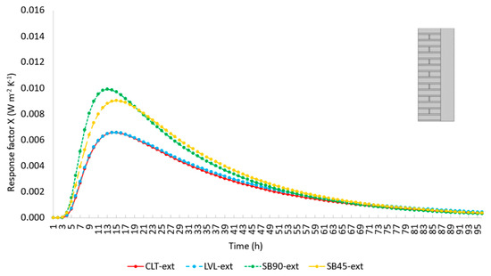 Notwithstanding, the theory [49,50,51,52,53,54,55] defines response factors as responses to a unitary temperature solicitation of 1 K, however the simulation was run by setting the temperature increment to 10 K. Indeed, a unit change in temperature would produce heat fluxes that are not graphically appreciable, especially for the retrofit solutions. Heat fluxes were then divided by 10 K with the aim of obtaining a unitary response X (W m−2 K−1), and values were reported for each hour over a period of 4 days (as seen in Equation (11)). This range of time is also the simulation time selected for the analysis, and it was obtained by considering the analyzed component that had shown the longest thermal response in order to not neglect significant terms in the series.