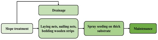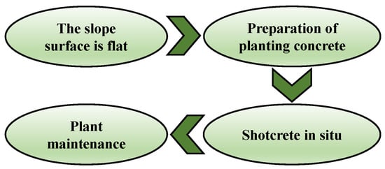 - Soil-spray-planting slope treatment: similar to hydraulic-spray-planting slope treatment, this technique also employs hydraulic-spray-seeding technology. The slope treatment process involves two steps [65]. Firstly, soils, binders, and water-retaining agents are mixed in a certain proportion to create a guest soil, which is then sprayed onto the slope surface, using a hydraulic press. This improves the slope surface, making it suitable for plant growth. Subsequently, a new mixture of plant seeds, fertilizer, soil, water-retaining agent, and binder, is sprayed onto soils. Compared to hydraulic-spray planting and slope-treatment technology, this method enhances the growing environment for slope plants, and has a wider application range. However, due to its high water consumption, complex construction technology, and high cost, this method is not suitable for areas with cold climates and arid conditions [66].