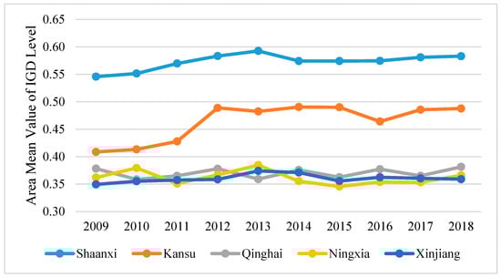The average level of IGD in the provinces in the northwest section of the Silk Road Economic Belt from 2009 to 2018.