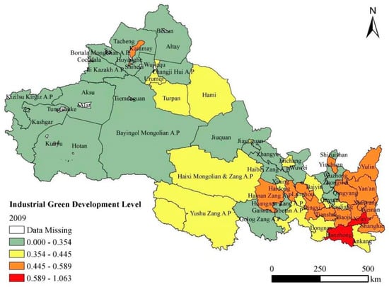 In recent years, as China has emphasized high-quality economic development, an increasing number of cities have called for a greening of their economic growth. The Silk Road Economic Belt is a new economic development region formed by China in 2013, building upon the concept of the ancient Silk Road. Located inland, the cities along this belt possess abundant natural resources, contributing to rapid industrial development [1]. However, the rapid development of industry is inevitably accompanied by negative effects such as high energy consumption, pollution, inefficient production methods, ecological degradation and the depletion of natural resources. The concept of green development can be traced back to the 1960s when the American scholar, Boulding, published Stable Economics [2]. This concept has prompted a growing number of countries and institutions to focus on IGD. Germany proposed “GreenTech Made in Germany 2018: Umwelttechnik-Atlas für Deutschland” in 2018 [3] and the UK proposed the “Green Industrial Revolution Ten-Point Plan” in 2020 [4]. Industrial development, as a significant component of this growth, has become a crucial direction for promoting the transformation and upgrading of the industrial structure.