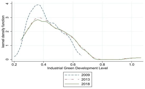 To further compare the disparity in IGD among different cities, this study employs the kernel density estimation method to illustrate the dynamic evolution trends of IGD in the urban clusters along the northwest segment of the Silk Road Economic Belt for the years 2009, 2013 and 2018, as shown in Figure 3.