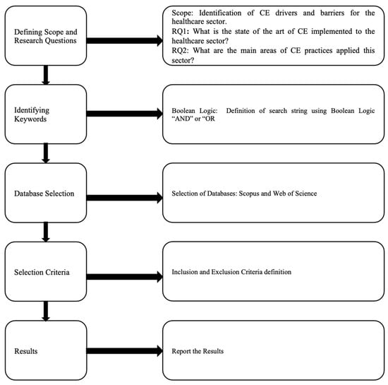 First, the study objectives, questions, keywords, inclusion and exclusion criteria, and databases were developed. Scopus and Web of Science (WoS) were used concurrently as main sources through the employment of chosen keywords in the title, abstract, and keywords of publications according to the Boolean operators “OR” and “AND”. The preference for these two sources was to ensure the inclusion of peer-reviewed articles. These articles, found in reputable journals, are considered high-quality studies, and their relevance and significance were verified [29].