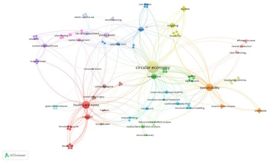 The bibliometric analysis has outlined that the CE concept applied to the healthcare sector as a relatively recent development, as the first article in the collected sample was published in 2016; however, from 2021 to now, the increasing number of articles shows the growing interest of researchers on this topic, with a specific focus in Europe. In this regard, the analysis of keyword occurrence underscores the prevalence and interconnectedness of sustainability and healthcare waste within a CE. Remarkably, keywords such as “remanufacturing” are linked to the plastic waste issue, as it can be considered a solution to the plastic problem. Specifically, following an evaluation of the mechanical recycling of clinical plastic waste for secondary plastic recovery, it becomes evident that incorporating a design that considers the environment in the initial stages of plastic production is essential. This ensures the feasibility of post-use segregation and remanufacturing and enables the assembly and disassembly of material components as needed, thereby extending product life cycles indefinitely [60]. Further, it is evident that ORs are responsible for generating huge amounts of waste, suggesting that the implementation of reusable solutions could serve as a viable remedy [30]. Similarly, the connections between “waste management”, “single-use plastic”, and “decontamination” keywords can be attributed to the substantial usage of single-use plastic products in this sector, which ultimately leads to waste. Particularly, potential strategies for addressing this issue encompass several options, such as reducing the demand for single-use bottles, exploring alternative solutions for eliminating them, encouraging manufacturers to address product design [45], and motivating policymakers to implement consistent labeling systems for the recycling of materials and the enhancement of waste management and to implement collaborative efforts and assistance systems to achieve sustainable resource management [45].