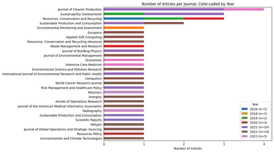 The thickness of the lines in the map indicates the strength of the correlations between the nodes (keywords). This strength is calculated by tallying the number of publications where the two keywords appear together. A total of 122 fixed keywords were tested in order to standardize the topics. Of the 122 items in the network, 117 items were connected to each other. The resulting network graph presents clear connections among the investigated keywords, grouped in colored clusters. The most frequently occurring keywords in the study are “circular economy”, “healthcare waste”, “sustainability”, and “plastic waste”. Specifically regarding “plastic waste” and “healthcare waste”, they appeared connected with “life cycle assessment”. Additionally, the network analysis revealed a connection between the issue of “plastic waste” and “remanufacturing”, as they appeared in the same cluster (liliac). Furthermore, there is a correlation between “operating rooms” (ORs) and “reuse” (blue cluster). Similarly, the keyword “Industry 4.0” occurs many times and is linked to the repeated keyword “Internet of Things”, and also connected to “sustainable supply chain”, to which technologies and the keyword “stakeholder involvement” (light blue cluster) were interconnected, aiming at the achievement of circularity. Moreover, the keywords “waste management”, “single-use plastic”, and “decontamination” are consistently grouped together (purple cluster). Lastly, “recycling” and “reprocessing” practices are strictly interconnected with a CE (grouped in the dark yellow cluster). Further, to inspect the progress of implementation of CE practices in the healthcare sector, the final group of 36 papers was analyzed by year and considering the journal of publication, as shown in Figure 4. This provides a snapshot of the scholarly activity and the dissemination of knowledge regarding the subject matter.