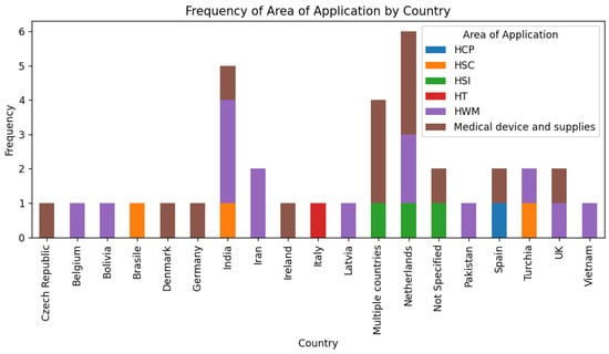 Further, another important area of application has been identified, medical devices and supplies (39%), which encompasses a wide range of practices involving apparatus, tools, implants, in vitro reagents, and disposable or semi-disposable elements used individually or in combination for medical purposes. The focus on practices related to the circular use of devices and supplies is most pronounced in Europe, with three studies conducted in the Netherlands [34,51,62] and two articles spanning multiple countries, labeled as “Multiple Countries” [40,53]. Furthermore, individual studies in this category are located in various European countries, including the United Kingdom [55], the Czech Republic [64], Ireland [45], Spain [65], Denmark [66], and Germany [49]. Moreover, one work within this area does not specify a geographical region and has consequently been categorized as “Not Specified” [48].