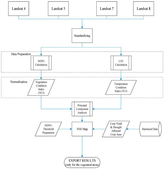 Furthermore, the land surface temperature (LST) serves as an indicator of the Earth’s surface temperature, reflecting its warmth or coolness to the touch [34]. In determining the LST, thermal bands were employed, with Ghaleb et al. [28] noting that for Landsats 4, 5, and 7 it is the sixth band, while for Landsat 8 it involves bands 10–11. The sensors within the Satellite Thermal Infrared (TIR) category gauge top-of-the-atmosphere (TOA) radiances, enabling the derivation of brightness temperatures through the application of Plank’s law [35]. Specifically focusing on Landsat 8 imagery, both bands 10 and 11 are accessible, but band 10 was favored due to calibration uncertainties associated with the band 11 Landsat 8 Thermal Infrared Sensor (TIRS). Figure 3 below illustrates the VHI map process, focusing specifically on vegetated areas.