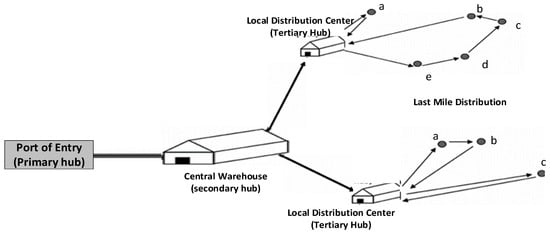 Moreover, the central warehouses identified in Figure 5 are intended to serve as hubs for local distribution in the adjacent towns and villages. The warehouses selected are linked to central warehouses and port of entries via regional road links (as per Figure 5). Although a Near Neighbor Analysis algorithm, implemented in QGIS, was used to ascertain the closest towns and villages to each central warehouse, , a good distance metric helps in improving the performance of the classification, clustering, and information retrieval process significantly. In Near Neighbor Analysis in QGIS, both Euclidean and Manhattan distance methods are applied to find the nearest neighbors of features based on their spatial locations. Unlike the Euclidean distance that calculates the straight-line distance using the Pythagorean theorem, the Manhattan distance is the sum of the absolute differences in their Cartesian coordinates. The input parameters include the input layer (primary hubs), near layer (secondary, tertiary, and last hubs), search radius (distance), and humanitarian inventories (warehouses). Meanwhile, the output includes a new attribute in the input layer, storing the distance to the nearest neighbor.