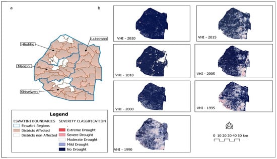 The examination of Vegetation Health Index (VHI) values throughout the last three decades, as illustrated in Figure 6, highlights the variations in vegetation health, pointing to periods of drought stress. These fluctuations align closely with recorded drought events, affirming the efficacy of the VHI as a reliable tool for monitoring drought. The year 1990 stands out as a particularly challenging period in terms of drought disasters across all regions and agroecological areas in Eswatini. Apart from 1990, Figure 6 below illustrates, in Figure 6a, districts that have experienced drought disasters between 1990 and 2020. Meanwhile, Figure 6b depicts, with the assistance of VHI, the impact of drought disasters in the affected districts.
