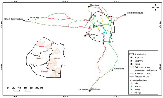 Outside of the two primary cities housing the central warehouses, bordering towns like Nhlangano or Siteki play a crucial role in inventory management due to factors such as (1) the availability of infrastructure, (2) a concentrated number of vulnerable populations, and (3) their proximity to certain points of entry. Utilizing the Open Route Service (ORS) algorithm in QGIS, this study calculated the fastest, shortest, and recommended routes. As depicted in Figure 7 below, the analysis revealed that, owing to the excellent condition of regional roads linking Eswatini to South Africa and Mozambique, the fastest and shortest routes suggested by the algorithm connected the central warehouses to ports of entries.