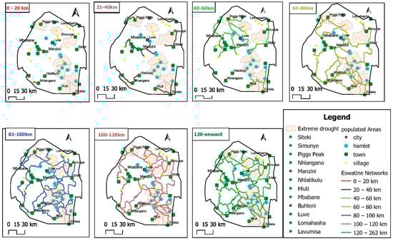 The spatial depiction of drought severity, classified using the Vegetation Health Index (VHI), offers valuable insights into the regions most significantly impacted by agricultural drought. Areas characterized by extreme, severe, and moderate drought levels demand immediate attention for focused relief efforts. The agricultural shortfall has had a direct impact on regions with a higher population density. Taking into account the previously mentioned factors, this study has chosen seven central warehouses strategically located in populated centers, including cities and towns, across Eswatini. The local distribution areas targeted include cities, towns, hamlets, and villages located in areas revealed as vulnerable from extreme drought severity, according to Figure 6. Additionally, foreign hubs have been identified for replenishment purposes. Table 6 below provides a comprehensive list of cities, towns, hamlets, and villages associated with each hub.
