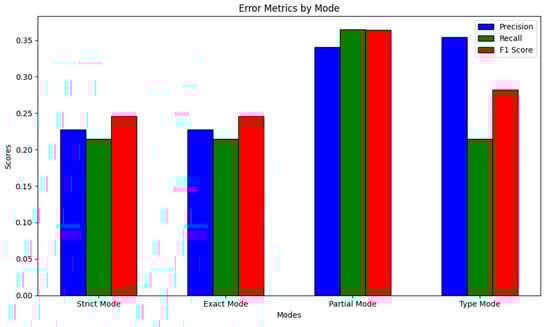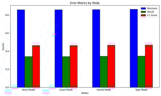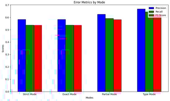 Precision and recall have close values in the strict and exact modes, which may indicate homogeneity in the model, but the accuracy and completeness of the model in these modes are low.
