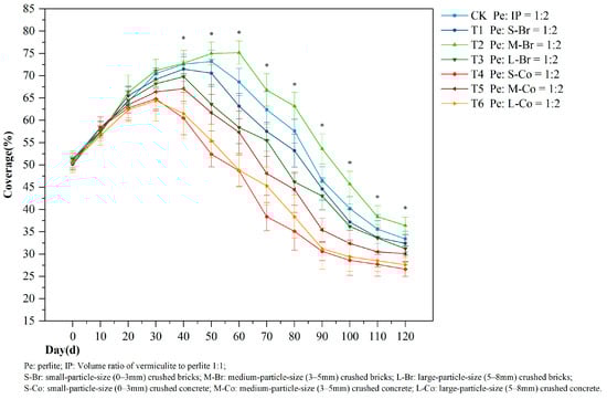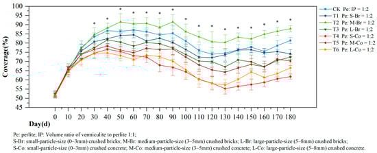 The change in coverage of Sedum lineare in each group (mean ± SE; n = 6) with time in the roof environment. The asterisk indicates a significant difference among the seven groups (p < 0.05).