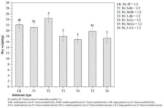 Previous studies have demonstrated that substrate thicknesses of 10–25 cm can support the growth of green roof plants [48,49]. Hence, the experiment set the substrate thickness at 12 cm. Construction waste materials, including crushed bricks (Br) and crushed concrete (Co), were sourced from Shanghai Pudong Xingsheng Road Base Material Co. (Shanghai, China). Three particle sizes—small (less than 3 mm), medium (between 3–5 mm), and large (between 5–8 mm)—were acquired through the removal of impurities and sieving. The abbreviations S, M, and L were employed to denote the three sizes of particles, respectively. Peat (Pe) and perlite were purchased from Shanghai Dingze Horticultural Co. (Shanghai, China ) The substrate composition was set as a ratio of peat to inorganic particles at 1:2 (v/v), whereas inorganic composition in group CK (the volume ratio of vermiculite to perlite was 1:1) was denoted by IP. The ratio of each substrate treatment is presented in Table 2. T1–T3 represent crushed brick substrates; T4–T6 represent crushed concrete substrates. Each group of substrates was packed in a rectangular plastic container, with a size of 42.0 × 29.5 × 13.0 cm. Two drainage holes with a diameter of 1.0 cm were, respectively, located on each side of the container and 1.5 cm away from the bottom of the container. Water storage space can be formed below the drainage holes.
