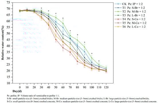 The change in relative water content (RWC) of Sedum lineare in each group (mean ± SE; n = 3) with time in the simulated drought stress experiment. The asterisk indicates a significant difference among the seven groups (p < 0.05).
