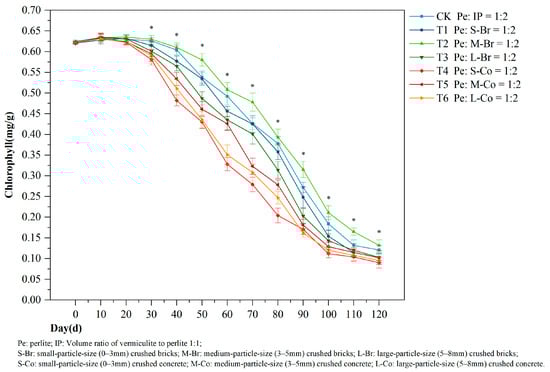The change in chlorophyll content of Sedum lineare in each group (mean ± SE; n = 5) with time in the simulated drought stress experiment. The asterisk indicates a significant difference among the seven groups (p < 0.05).
