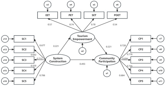 The results from confirmatory factor analysis indicate a good fit for this model. A structural equation model test was conducted using AMOS 24, and a visual path analysis is presented in Figure 2. The path analysis results are summarized in Table 7: the standardized path coefficients for system construction affecting tourism empowerment, tourism empowerment influencing community participation, and system construction impacting community participation are 0.493, 0.221, and 0.221, respectively, all statistically significant. Hence, the empirical data support hypotheses H1, H2, and H3.