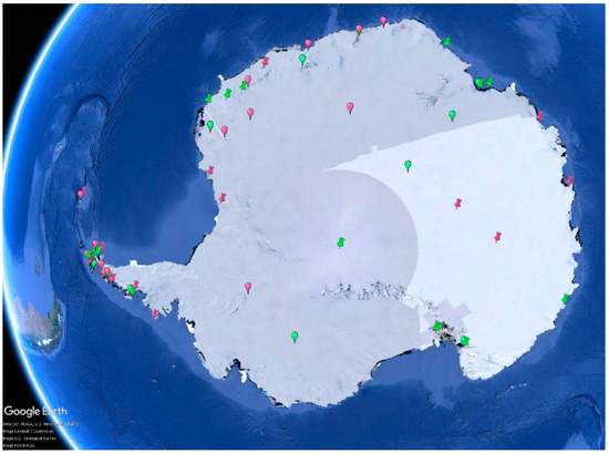 This figure illustrates the different energy sources used at research stations in Antarctica. The green pins represent year-round stations with experience in using renewables. The red pins represent year-round stations without experience in using renewables. The green bubbles represent seasonal stations with experience in using renewables. The red bubbles represent seasonal stations without experience in using renewables.