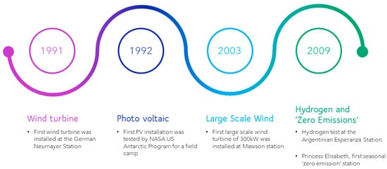 This figure highlights the milestones in the development of renewable energy in Antacrtica. The start of testing renewable-energy sources such as wind and PV started in the early 1990s, followed by a second phase in the 2000s with the deployment of larger scale renewables and testing new technologies under Antarctica conditions.