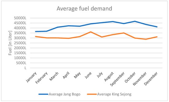 This figure shows the average fuel demand from 2018–2023 for Jang Bogo Station and King Sejong Station.