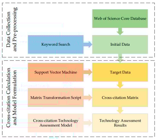 The research methodology employed in this study is shown in Figure 1 and comprises two main components: (1) Data collection and pre-processing, and (2) Cross-citation calculation and model formulation. The initial stage involves retrieving potentially relevant papers from the Web of Science core database using key search terms pertaining to the specific technical domain. Subsequently, the collected papers are refined using a binary classifier that employs term frequency to differentiate between relevant and irrelevant sources. The initial step encompasses retrieving potentially pertinent papers from the Web of Science core database by employing key search terms aligned with the specific technical domain of interest. The collected paper is then refined using a binary classifier, which utilizes term frequency to discern between relevant and irrelevant papers. The subsequent step involves computing cross-citations among corresponding papers for each technology within the domain, resulting in the creation of a cross-citation matrix. Subsequently, a technology assessment model is proposed that incorporates the cross-citation matrix to generate advanced assessment results for each technology.