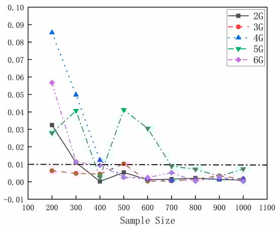 Since the number of papers for the five technologies from 2G to 6G varies significantly, this paper first determines the sample size to be used for SVM classifier learning. We trained the SVM classifier using different sample sizes for each of these five technologies. The resulting classifiers were then used to classify all paper corresponding to each technology. We calculated the variation of classification effect with sample size for paper corresponding to each technology using Equation (1). Figure 2 shows a schematic diagram of how the number of classified documents stabilizes with training sample size.