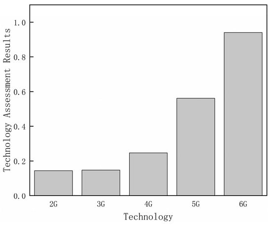 The matrix of interleaved quantities is entered from Table 4 into the technology assessment model corresponding to Equation (7) in this paper. This allowed us to obtain quantitative results for the advancement of each mobile communication technology as shown in Figure 3. When quantified using all years of papers, the results for technological advancement of mobile communication technologies align with our expectations in terms of size relationships. Additionally, we found that the technology assessment gap between 4G, 5G, and 6G is significantly higher than that between 2G, 3G, and 4G. This is because our paper quantifies relative technological sophistication and the latest mobile communication technologies (5G and 6G) are much more sophisticated than earlier generations (2G, 3G, and 4G).