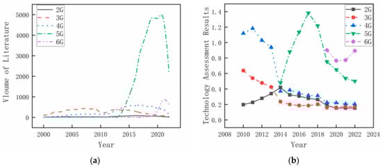 To discern the temporal development trend of each technology, we conducted a year-by-year quantification of mobile communication technologies, initially counting the volume of relevant papers as displayed in Figure 4a. To mitigate the instability in technology assessment results due to sparse paper data, the commencement year for the assessment was set at 2010, where papers spanning 2000–2010 was considered. Moreover, the inception year needed to satisfy the condition that the annual volume of papers reached at least 1% of the technology’s total papers volume. Upon fulfilling these criteria, the assessment’s inception year was thus established as 2010 for 2G, 3G, and 4G, 2014 for 5G, and 2019 for 6G. The ensuing technology assessment results for mobile communication technologies over time are depicted in Figure 4b.