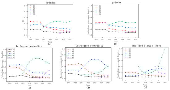 Technology assessment results of mobile communication technologies using h-index (a), g-index (b), In-degree centrality (c), Out-degree centrality (d), and modified Xiang’s index (e) methods.
