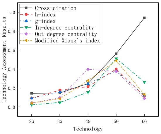 Figure 6 contrasts the results obtained by each technology assessment method for 2G–6G technologies over the entire duration. The method proposed in this study yielded reasonably accurate results; however, the assessment rankings obtained through the use of five other methods failed to precisely reflect the actual scenario. This inaccuracy is particularly notable in the 6G assessment results, which are deemed inferior among the 2G–6G technologies when gauged using the other five methods, i.e., h-index, g-index, In-degree centrality, Out-degree centrality, and modified Xiang’s index. Specifically, 4G is prioritized when using in-degree centrality for technology assessment, while the remaining four methods consistently favor 5G. This inconsistency is ascribed to the five alternate technology assessment methods’ reliance on the quantity of publications and citations (both citation and cited quantities). Conversely, our study introduces a cross-citation method that examines technology from the perspective of knowledge flow, yielding a more agile and precise assessment.