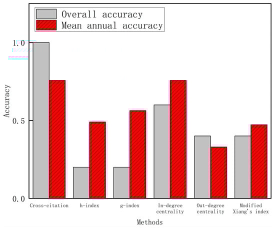Figure 7 illustrates the aggregate accuracy and mean annual accuracy of the ranking, resulting from the implementation of our proposed method in conjunction with the other four assessment techniques. As can be observed in Figure 7, the highest accuracy rates are realized when employing the method proposed in this paper. Particularly, our method, paired with in-degree centrality, delivers optimal results in terms of mean annual accuracy. Of significance is the remarkable overall accuracy, reaching a 100% score, yielded by our cross-citation-based method, a figure considerably superior to the other four methods.