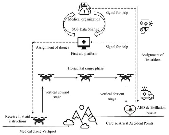 Considering the stakeholders involved in accidents, the operational characteristics of medical drones, and the specificities of OHCA accidents, the operational procedure of medical drones unfolds as follows: OHCA accidents occur randomly within the designated research area. Upon discovering a patient, first responders and bystanders use mobile phones or wearable devices to initiate emergency calls and distress signals. Subsequently, they administer cardiopulmonary resuscitation (CPR) following operational guidelines provided by the emergency platform. Upon receiving the distress signal, the emergency platform ascertains the accident’s location, leveraging bystander descriptions and mobile GPS positioning. It promptly dispatches the most time-efficient medical drone to provide immediate medical assistance to the patient. Simultaneously, relevant data and information are shared with higher-tier medical platforms. Upon receipt of the emergency directives, the medical drone swiftly departs from its designated vertiport (referred to as the drone’s accompanying cabin). Following ascent to an appropriate altitude, the drone transitions into a horizontal cruising phase. As it nears the accident location, it hovers and executes a landing. Bystanders retrieve the AED from the medical drone and use it to perform defibrillation on the OHCA patient, following operational instructions, until the arrival of emergency personnel. This comprehensive approach not only ensures the patient’s well-being but also contributes to an enhanced survival rate.