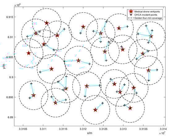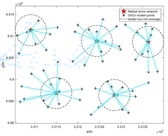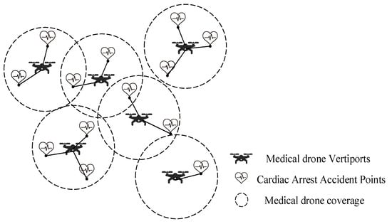 Based on the operational mode of medical drones, the issues can be outlined as follows: Multiple OHCA accident sites within a specific region are assumed to exist, and the coordinates of these sites are known. Specialized integrated medical drones equipped with AED facilities are deployed to address out-of-hospital emergency requirements. Upon receiving emergency instructions, the medical drone nearest to the accident site departs from its vertiport, initiating phased flights to reach the OHCA accident site. Following collaborative intervention by first responders and advanced medical facilities, the medical drone equipped with AED facilities returns to its vertiport for recharging and recovery operations to ensure efficient and prompt responses to subsequent emergency calls. This study takes into account various factors, including patient survival rates, the phased operational characteristics of medical drones, and flight coverage. It explores the optimal layout plan for medical drone vertiports within the selected region, as illustrated in Figure 2. The relationship between the drone vertiports and the accident sites is one-to-many, signifying that each OHCA accident site can be serviced by the nearest medical drone vertiport. Conversely, a single medical drone vertiport can respond to the emergency demands of multiple OHCA accident sites.
