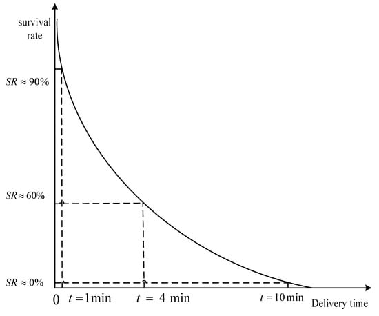 During the treatment of OHCA patients, survival rates are influenced by various medical factors, including the patient’s physical condition, CPR, and defibrillation. Among these factors, defibrillation plays a significant role in determining patient survival rates. Consequently, this study focuses on evaluating the impact of AED delivery time on the survival rate of OHCA patients. Medical research reveals that, in cases of cardiac arrest, every minute of delay in defibrillation results in a substantial decline in survival rates, ranging from 7% to 10%. When administering defibrillation within the first minute of cardiac arrest, the patient’s survival rate can reach as high as 90%. However, this rate decreases to approximately 50% after 5 min, to around 30% after 7 min, and plunges to a mere 2–5% beyond the 10-minute mark. Furthermore, critical time intervals known as the “golden 4-minute” and the “platinum 10-minute” exist during the treatment of cardiac arrest patients. Within the initial 4 min following cardiac arrest, irreversible brain damage occurs. If this critical timeframe is exceeded, even if the patient is successfully resuscitated, there is a significantly elevated risk of brain death or entering a vegetative state. Considering these research findings and the importance of time intervals in the rescue process, this paper constructs a survival rate function for OHCA patients. Figure 3 provides a schematic representation of the OHCA patient survival rate function.