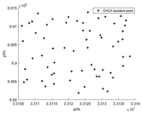 According to the seventh census data of China in 2020, the number of permanent residents in Jinnan District is 928,066,000. Among them, the proportion of elderly people over 60 years old is 15.9%. OHCA accidents mostly occur in out-of-hospital public places and at home, primarily affecting the elderly, with an incidence rate of 41.8 per 100,000 people. Considering the population size, the proportion of elderly people, and the OHCA incidence rate in the study area, as outlined in Section 2.1, it can be estimated that there are approximately 62 OHCA accidents in Jinnan District per year. For the subsequent distance operations in this paper, Euclidean distance is utilized. Therefore, the latitude and longitude coordinates of the accident points need to be converted to planar coordinates. This conversion facilitates subsequent calculations in the study and is adapted to the algorithm’s model constraints. The MATLAB tool was employed to convert the coordinates using Miller’s projection. The converted planar coordinates of the OHCA accident points are distributed as shown in Figure 5.