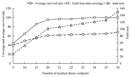 The relationship between the system operation cost and the number of vertiports is shown in Figure 8. The total cost of system operation includes the fixed cost of construction and operation of medical drone vertiports and the path cost. As the number of selected medical drone vertiports increases, the fixed cost of the system rises. However, with a growing number of vertiports, the distance between the vertiports and the OHCA accident points decreases, leading to a significant reduction in the total flight distance of the system and a gradual decrease in path cost. In Figure 8, it is observed that the total system operation cost increases gradually with the rise in the number of medical drone vertiports. When the number of vertiports is below 20, the total system operation cost rises faster, while when the number of facilities increases from 24 to 25, the total system operation cost rises more slowly, at 4.11%. However, the “golden 4-minute “coverage and the average patient survival rate show little to no change. This suggests that surpassing 24 vertiports will only increase the total cost of operating the system without significantly improving the average patient survival rate and the “golden 4-minute” coverage rate.