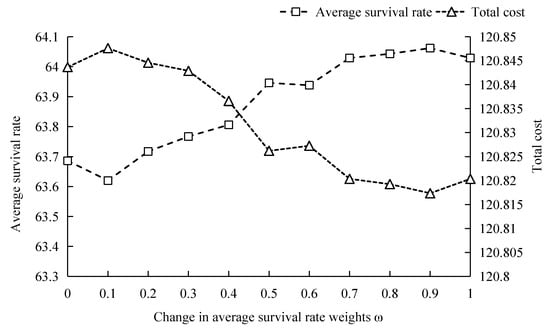 In this paper, the average survival rate of OHCA patients and the total cost of operation are regarded as two objectives. Changes in the weight of the objective function can influence the results of the case operation. Therefore, the paper conducts experiments based on the current optimal vertiport selection results, that is, 24 medical drone vertiports achieving full “golden 4-minute” coverage. The value of the objective function with varying weights of the average survival rate is shown in Figure 10.