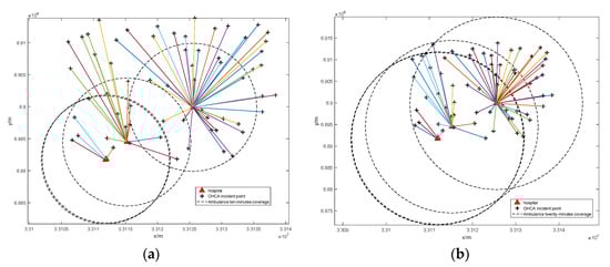 Ambulance coverage at different times. (a) Map of ambulances’ 10 min coverage area; (b) Map of ambulances’ 20 min coverage area.