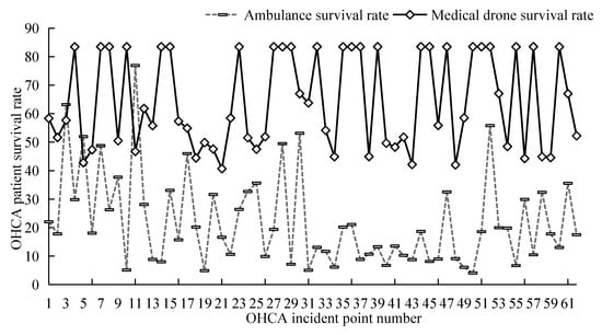 Upon analyzing the coverage and emergency response capabilities of ground emergency service facilities, namely hospitals and ambulances, to OHCA accident sites, we now compare and analyze the survival rates when ground emergency service facilities respond versus when medical drones are applied for response, the comparison results are shown in Figure 12. The survival rate is compared at 24 medical drone vertiports, revealing that the survival rate is higher when medical drones are applied for response and treatment compared to ground ambulances. The application of medical drones results in an average survival rate of 64.06%, whereas ground ambulances yield an average survival rate of 22.10%. This comparison found that the application of medical drones for OHCA response increases the average survival rate of patients by 41.96%, signifying a crucial advancement in saving lives.