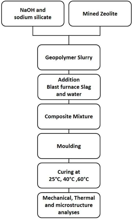 Zeolite ore, 5 M sodium hydroxide, and sodium silicate liquid were combined using a mechanical stirrer for 20 min to create a consistent slurry. BFS was then incorporated into the blend at a BFS/solid mass ratio of 10%, 20%, or 30% [39], with sufficient water added to achieve a water/solid mass ratio of 7.7%. The ratios of solid to liquid and sodium hydroxide to sodium silicate were maintained at 1.3 and 3.5, respectively, throughout the process. Adding BFS at the end was crucial due to its rapid setting properties, as premature addition could cause early hardening of the mixture, hindering the dissolution of the mined zeolite. The prepared slurry was cast into cylindrical molds (100 mm in height and 50 mm in diameter) and cured at ambient temperature, 40 °C, and 60 °C for up to 28 days. We considered 5 repetitions for each sample to ensure the reliability and reproducibility of the results. All samples were sulfur-capped prior to the compressive strength testing. The experiment’s procedure is detailed in Figure 1. To avoid excessive drying during thermal curing, samples were hermetically sealed. For accuracy, all tests and characterizations were conducted in triplicate, with average results reported. Details of sample coding and synthesis methods are outlined in Table 2.