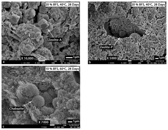 Morphological analyses of the samples were performed using SEM. An SEM image, illustrated in Figure 5a, reveals the cubical crystalline structure of zeolite A, a formation that was corroborated by XRD analysis. It was observed that zeolite A frequently forms in the geopolymers, with the inclusion of BFS, which is rich in calcium, playing a crucial role in its development, particularly under hydrothermal conditions [53]. Additionally, SEM/EDS identified spherical crystals of zeolite P, as shown in Figure 5b, and crystals of chabazite, as depicted in Figure 5c. The process by which amorphous aluminosilicate gels convert into crystalline zeolites remains incompletely comprehended. For further details on the morphology, including EDS images and analysis of the identified crystals, refer to the supplementary documents.